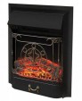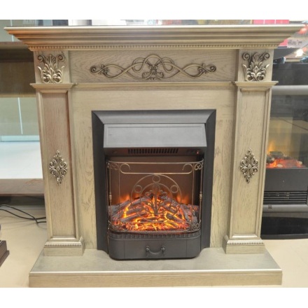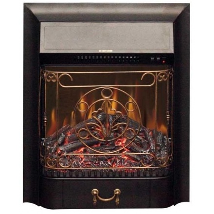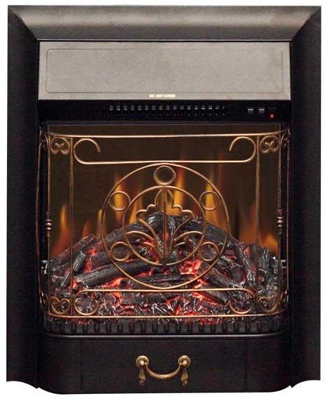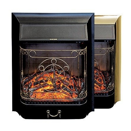 Электрический очаг с звуковым эффектом горения дров (регулируется) предназначен для встраивания в стандартные обрамления. Эффект пламени - сгоревшие дрова. Черная решетка имитирует колосниковую решетку настоящего дровяного камина. Два варианта рамки вокруг очага: черная или золотая. Нагреватель с поддувом спрятан в козырьке очага и обеспечивает обогрев в холодную погоду. Переключатель позволяет включать на полную или половинную мощность.