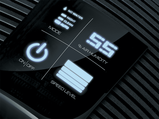 Управление интуитивно понятное и простое. Электронная панель с индикацией сразу показывает текущий уровень влажности в комнате и предупреждает о необходимости долива воды. Автоматический режим сам подбирает оптимальную интенсивность работы. А ночной режим отключает подсветку и снижает шум до минимума для вашего комфортного сна.
