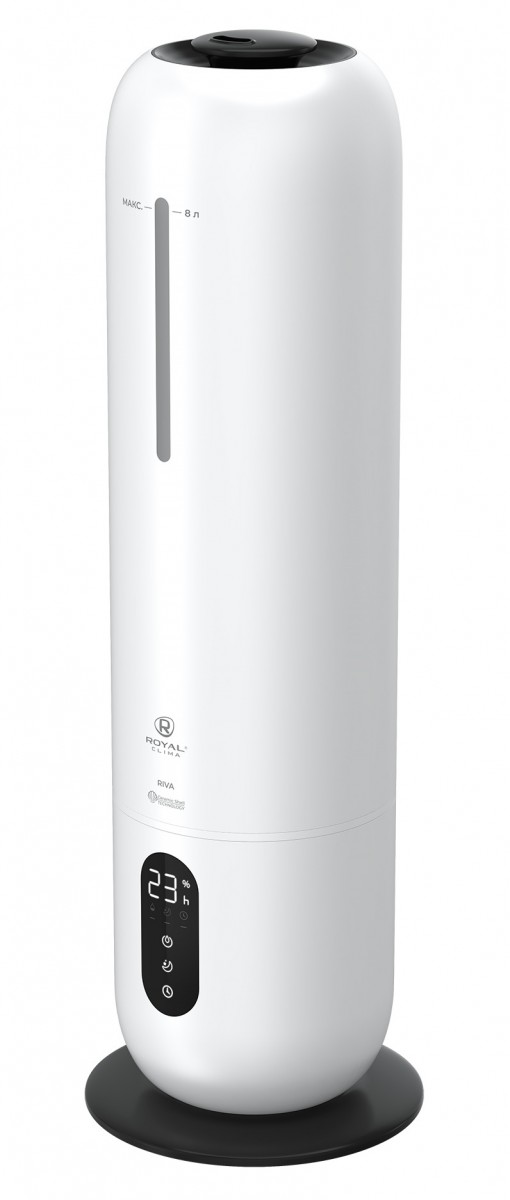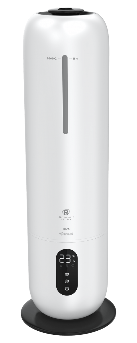 Увлажнитель воздуха RIVA от ROYAL CLIMA обладает революционным увеличенным объемом резервуара для воды: 8 литров. Работа без долива воды от 26 часов. Максимальная интенсивность увлажнения воздуха 300 мл/ч. Управление увлажнителем производится при помощи сенсорной панели на передней части корпуса или пульта ДУ. RIVA имеет 3 скорости выхода пара, таймер на отключение, LED-дисплей для индикации уровня влажности. Встроенный гигростат позволяет задать желаемую влажность воздуха. Прибор автоматически будет поддерживать указанное значение. Приятным дополнением является внутренняя подсветка резервуара для воды. Переливаясь цветами, она создаст в помещении атмосферу уюта. А для насыщения воздуха любимыми ароматами достаточно добавить несколько капель в аромакапсулу.