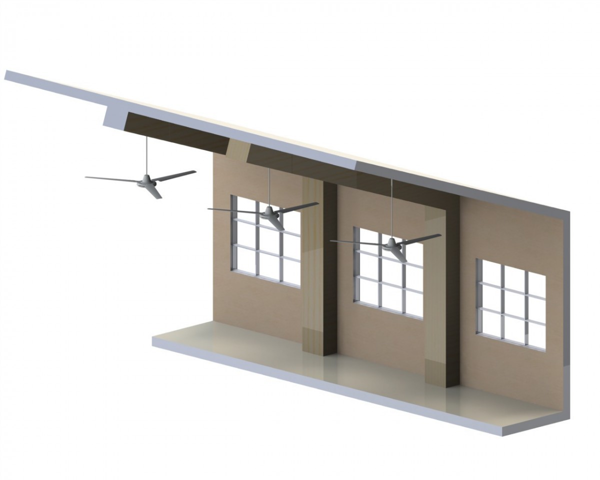 Вентиляторы изготавливаются из стали с полимерным порошковым покрытием белого цвета. Форма лопастей потолочных вентиляторов отвечает требованиям аэродинамики для перемещения значительных объемов воздуха с низкой скоростью. Вентилятор оборудован двигателем с внешним ротором на шарикоподшипниках.