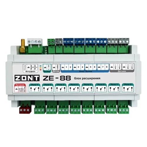 Блок расширения ZONT ZE-88 применяется на объектах с многоконтурной системой отопления, где системой автоматизации могут быть охвачены несколько сооружений. Он предназначен для расширения функциональных возможностей систем автоматизации и охраны, построенных на контроллерах Zont H2000+ PRO. Блок не требует отдельного программирования. При подключении к контроллеру в настройках автоматически появляется возможность использования входов и выходов блока для реализации алгоритмов контроля и управления.