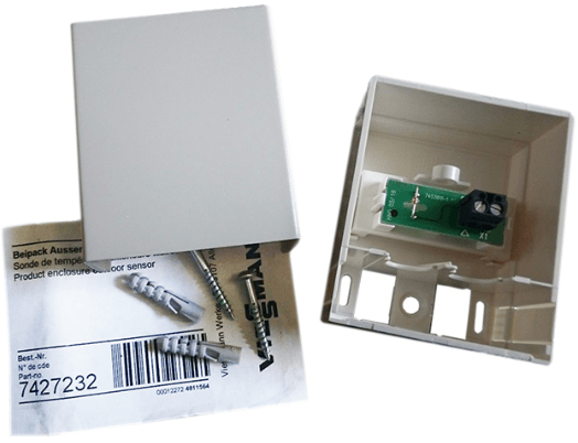 Датчик наружной температуры Viessmann для конденсационных котлов Viessmann Vitodens 100 служит для переналадки контроллера для работы в режиме погодозависимой теплогенерации.