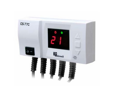 Контроллер KG Elektronik CS-77C является двухфункциональным устройством. Модель СS-77С независимо управляет двумя насосами: ЦО и насосом напольного отопления или ГВС. Условия работы насоса ЦО: заданием регулятора есть включение и выключение нассоса, когда температура превысит заданое значение и отключение при тушении котла. Это препятствует постоянной работе нассоса и экономит электрическую энергию. Условия работы другого насоса: В контроллере есть возможность регулирование температуры включения так и выключения насоса. Насос включается, при привышении установленной температуры включения и отключается при привышению установленной температуры отключения.