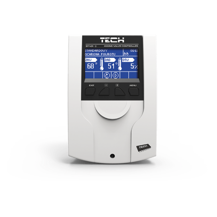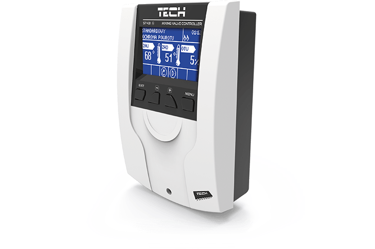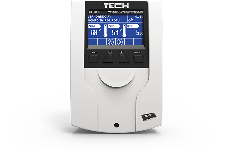 Терморегулятор типа ST-431N предназначен для обслуживания смесительного трёх- и четырёхходового клапана с возможностью подключения дополнительного насоса. Дополнительно этот контроллер может работать с двумя модулями клапана, что дает возможность управлять в общей сложности тремя смесительными клапанами. Этот контроллер оснащен функцией погодного управления, недельной программой и может взаимодействовать с комнатным регулятором. Дополнительным преимуществом устройства является защита температуры возврата, выполняющая функцию защиты от закипания воды в коротком контуре котла или от низкой температуры воды, возвращающейся в котел