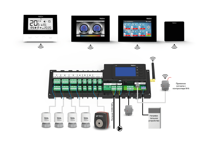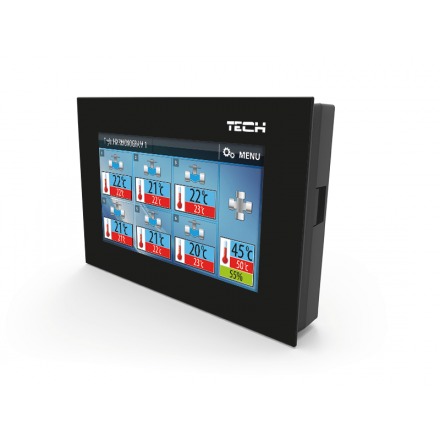 Панель управления TECH M-6 предназначена для управления ведомыми комнатными терморегуляторами. В случае использования комнатных регуляторов TECH R-6K имеет возможность изменять заданную температуру каждого из них и блокировку режима работы. После подключения двухпозиционных комнатных терморегуляторов (TECH R-6 или TECH R-6S), пользователь имеет возможность посмотреть состояния клапана (открытый либо закрытый). После подключения датчиков TECH C-6, пользователь имеет возможность изменения заданной температуры. Четкий и большой графический дисплей с подсветленный цветным экраном позволяет легко читать и изменять параметры. Простой монтаж в установочной электрической коробке (ø60 мм). Питание 230V 50 Hz.