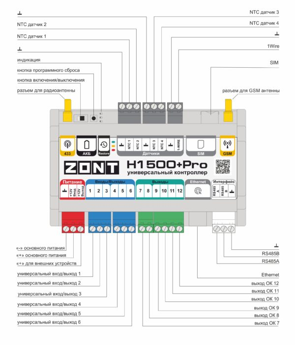 Контроллер ZONT H1500+ PRO имеет 6 выходов типа «открытый коллектор» и 6 универсальных входов/выходов, которые могут быть назначены выходом «открытый коллектор». 4 входа NTC предназначены для прямого подключения датчиков NTC.