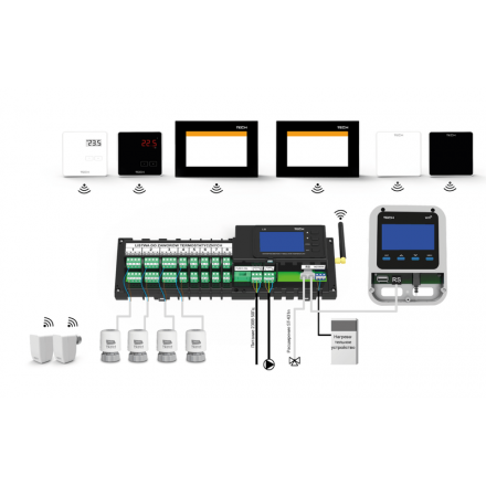 Терморегуляторы TECH R-8B устанавливаются в отдельных зонах нагрева. Они пересылают информацию о текущей температуре помещения до монтажной планки TECH L-8, которая на основе этих информаций управляет термоэлектрическими сервоприводами (открывает их, когда в помещении не достигнуто заданной температуры, и закрывает, когда достигается заданная температура).