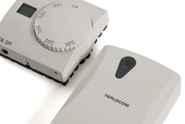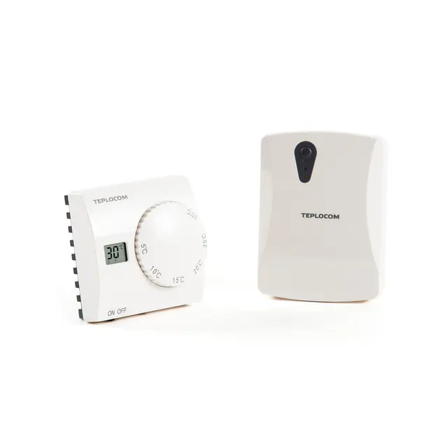 Беспроводной комнатный термостат состоит из термостата, который размещается в жилой комнате и приёмника, который устанавливается возле котла. Передача сигнала осуществляется по радиоканалу, а питание термостата при помощи батареек. К данному термостату не нужно прокладывать провода, поэтому его можно расположить в комнате, в любом удобном месте, это особенно актуально, если монтаж осуществляется после ремонтных работ в доме.