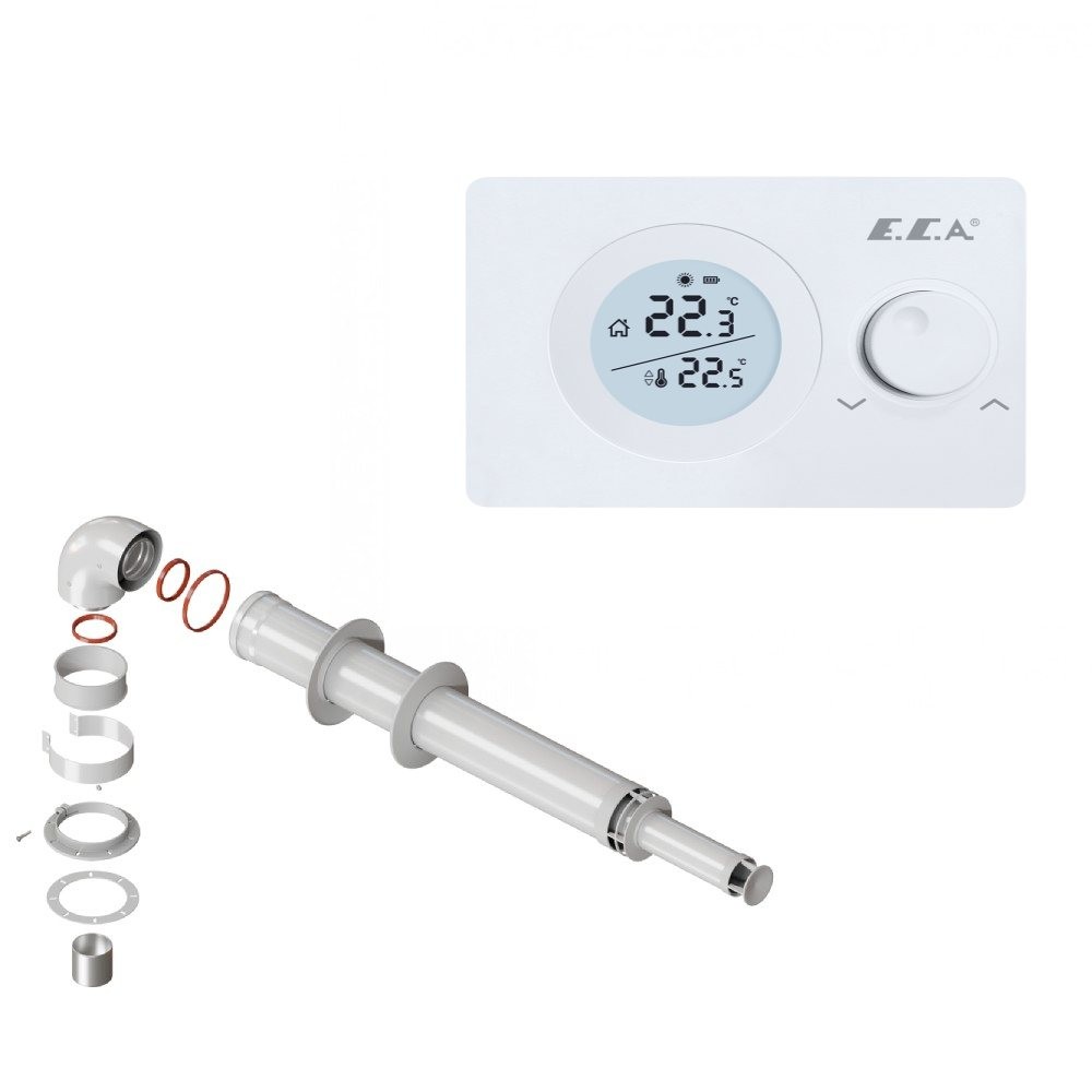 Комнатный беспроводной терморегулятор E.C.A. Pure 100 W – это напрограммированный термостат, который обладает основной одной программой и одной температурой. Данный термостат совместим для всех моделей комбинированных котлов. В терморегуляторе E.C.A. Pure 100 W эргономичный ЖК-дисплей, модуль включения и выключения. Роликовый контроль температуры комнаты с чувствительностью 0,1 C°. Термостат E.C.A. Pure 100 W простой и удобный в использовании.
