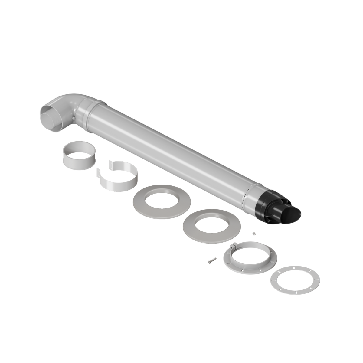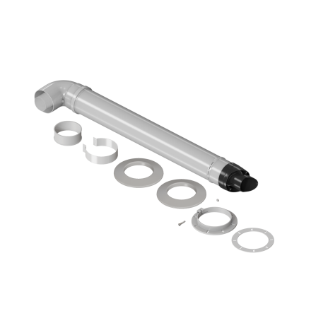 Комплектация: труба с наконечником 60/100 - 1шт, уплотнение EPDM D100 - 1шт, центрирующая пружина - 1шт, отвод стартовый 60/100 90гр - 1шт, уплотнение EPDM D60 - 1 шт, фланец комплект - 1шт, хомут комплект - 1шт, втулка D60 - 1шт, декоративная стеновая накладка - 2шт