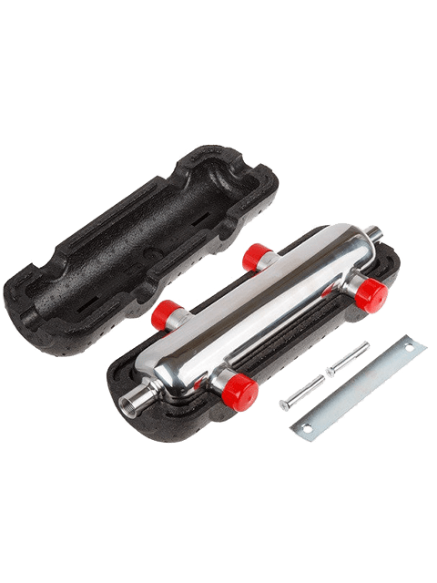 Внутри гидрострелка разделена мелкой сеточкой для улавливания шлама. Также возможно подключать сливной кран и автоматический воздухоотводчик