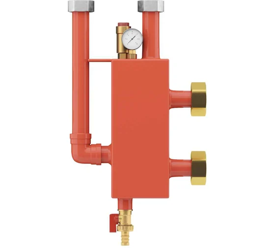 Гидравлический разделитель предназначен для разделения котлового контура и контура потребителей и представляет собой комбинированное устройство с автоматическим удалением воздуха и встроенным грязеуловителем. Применяется в жидкостных системах отопления и холодоснабжения. Имеет встроенный грязеуловитель. Накопленные примеси удаляются через дренажный кран при проведении сервисных работ.