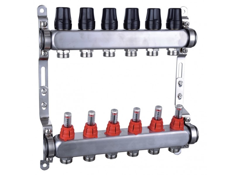 Коллекторная группа с расходомерами из нержавеющей стали SUS304 квадратного сечения в упрощенной комплектации без кранов и наконечников.Коллекторный блок служит для распределения потоков по контурам теплого пола,радиаторного отопления,прочих климатических систем, где в качестве теплоносителя используется вода либо незамерзающие растворы гликоля с максимальной рабочей температурой 90°C и рабочим давлением до 10 бар.