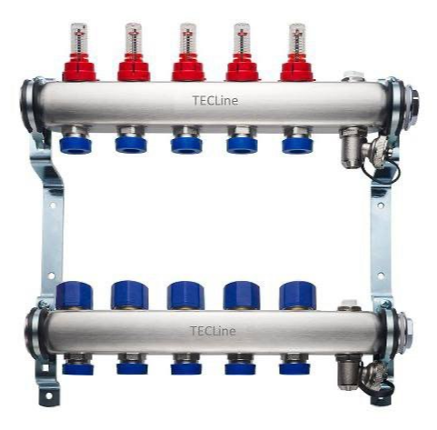 Гребенка водяного теплого пола TECLine применяется для распределения теплоносителя в контуры “теплого пола”. Распределительные гребенки TECLine можно выбрать с разным количеством выходов. Это позволяет применять их даже в самой сложной системе отопления.