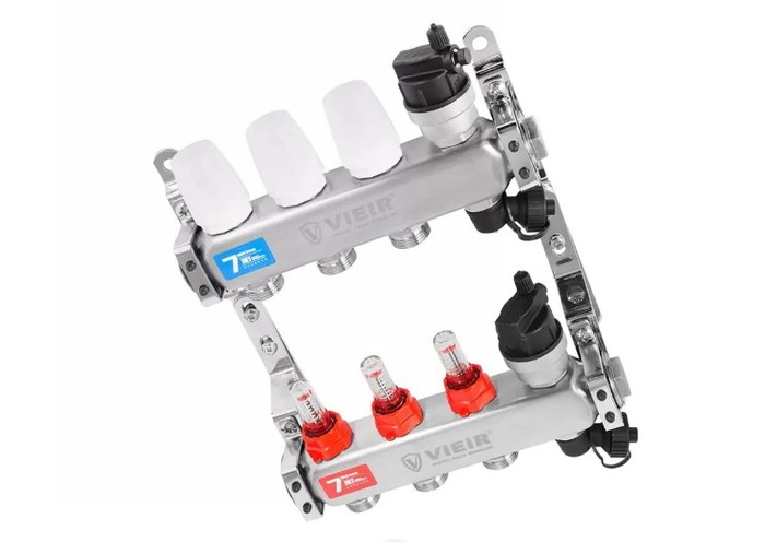 Коллекторные группы ViEiR предназначены для распределения и регулирования потоков теплоносителя в системах водяного радиаторного или напольного отопления "теплый пол" для распределения и регулирования рабочей среды индивидуально в каждом циркуляционном контуре. Коллекторная группа состоит из подающего и обратного коллектора, ручных настроечных клапанов c расходомерами или без расходомеров, термостатичесих клапанов (с возможностью установки электротермического сервопривода) и крепежных кронштейнов.