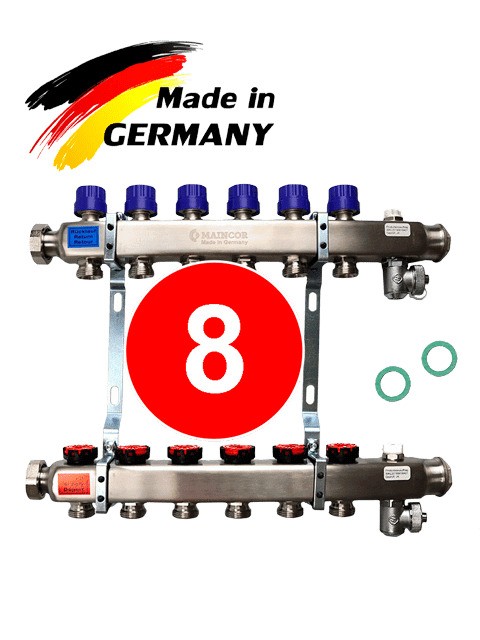 Коллекторная группа MAINCOR 50920008 из нержавеющей стали с двумя сливными кранами на 8 выходов для радиаторов