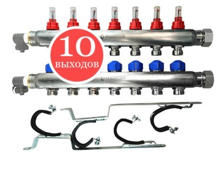 Коллекторная группа MAINCOR 50900010 из нержавеющей стали, с креплением, расходомерами, развоздушивателем, кранами слива, на 10 выходов
