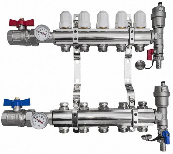 Коллектор распределительный (гребёнка) PROFLine XF 20102 латунный с термостатическими и балансировочными клапанами на 5 выходов.
