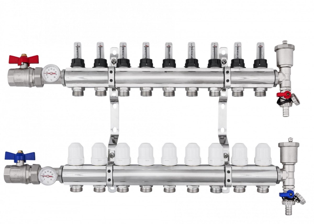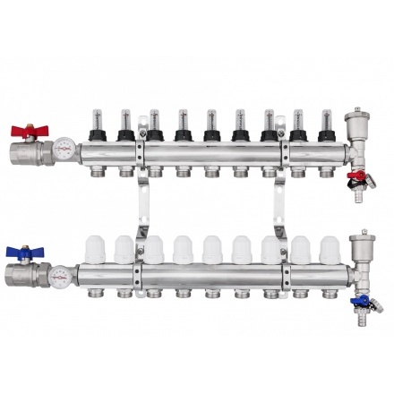 Коллектор распределительный (гребёнка) PROFLine XF 20135 латунный с термостатическими клапанами и расходомерами на 11 выходов.