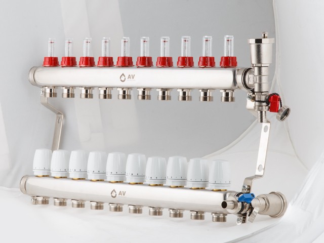 Коллекторная группа AVE136 AV Engineering предназначена для распределения и регулировки систем теплого пола. Материал изготовления коллектора - нержавеющая сталь.