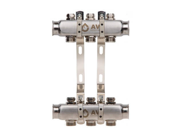 Коллекторная группа AVE162 AV Engineering предназначена для распределения и регулировки систем теплого пола. Материал изготовления коллектора - нержавеющая сталь.