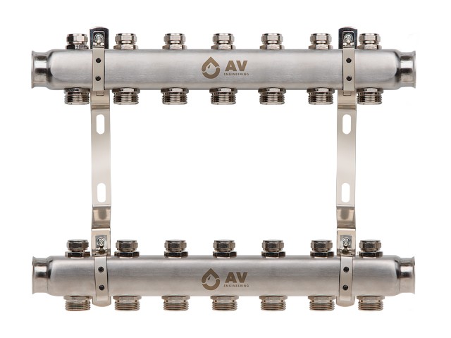 Коллекторная группа AVE162 AV Engineering предназначена для распределения и регулировки систем теплого пола. Материал изготовления коллектора - нержавеющая сталь.