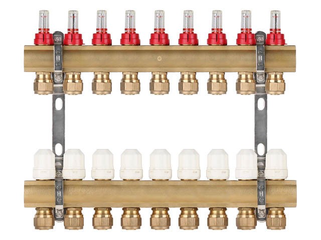 Коллекторная группа AV 9 выходов AVE777 латунная, для теплого пола, с расходомерами, регулировочные вентили, евроконус (адаптер) 20 (2.0)х3/4