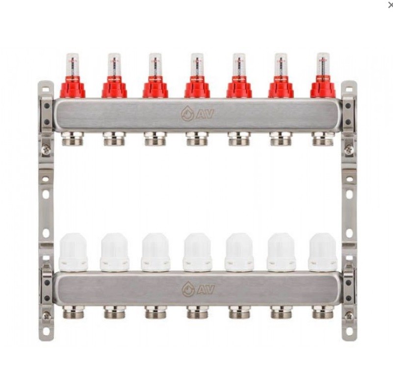 Коллекторная группа AV Engineering AVE136, 7 выходов, предназначена для распределения и регулировки систем теплого пола, материал изготовления коллектора - нержавеющая сталь.