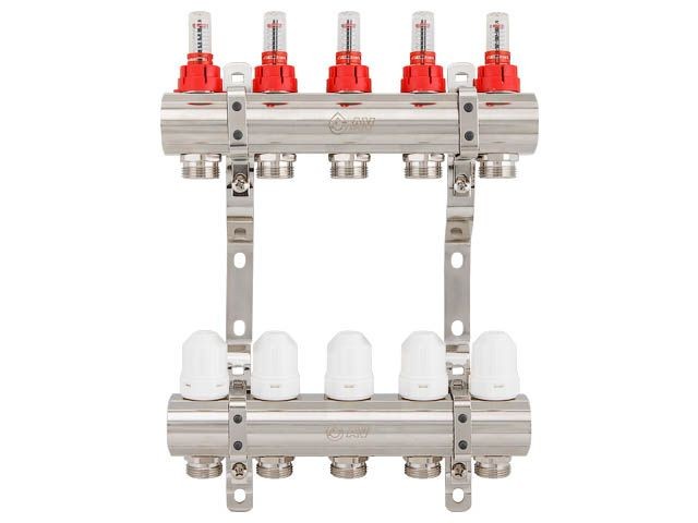 Коллекторная группа AV Engineering AVE777, 5 выходов, предназначена для распределения и регулировки систем теплого пола и водоснабжения, материал латунь