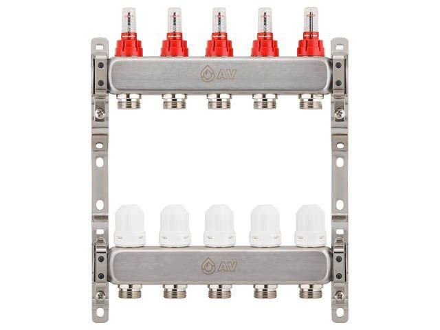 Коллекторная группа AVE136, 5 вых., AV Engineering из нержавеющей стали, для теплого пола и водоснабжения, гарантия 5 лет, резьба 3/4"
