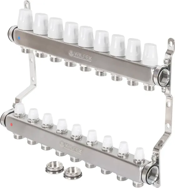 Коллекторный блок объединяет в себе подающий и обратный коллекторы из нержавеющей стали AISI304, ручные балансировочные клапаны, регулирующие клапаны (с возможностью установки электротермического сервопривода), пробки коллекторов и крепежные кронштейны из оцинкованной стали.