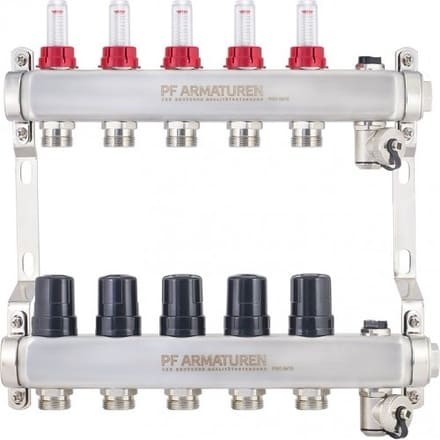 Коллекторная группа ProFactor 1"х3/4М (6) с расходомерами, термостатическими клапанами, дренажными клапанами и воздухоотводчиками.