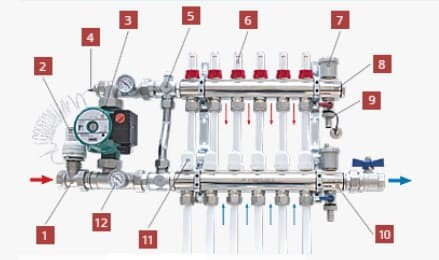 Для системы циркуляции теплых полов или радиаторного отопления применяются модули, состоящие из насосно-смесительных узлов и коллекторных групп. Насосно-смесительные узлы предназначены для принудительной циркуляции, регулировки и поддержания заданной температуры теплоносителя в ситемах отопления. Коллекторные группы используются для распределения потока транспортируемой среды по потребителям. Они позволяют осуществлять регулировку и контроль потока теплоносителя отдельно в каждом циркуляционном контуре.