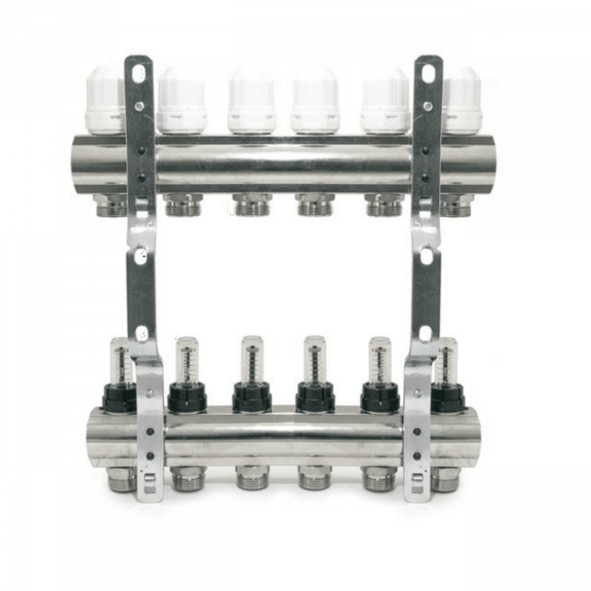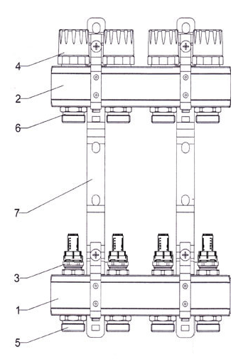 Коллекторная группа может использоваться на трубопроводах, транспортирующих жидкие среды, не агрессивные к материалам изделия (вода, антифриз на основе этиленгликоля не более 30%).