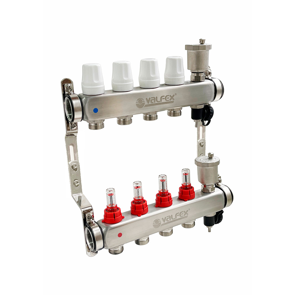 Коллекторная группа из нержавеющей стали со встроенными расходомерами и регулирующими клапанами ТМ VALFEX – позволяет производить балансировку петель при включенном циркуляционном насосе с помощью настроечных клапанов без фиксации, с расходомерами. В комплекте имеются автоматические воздухоотводчики, позволяющие удалять из системы накопление воздуха и газов.