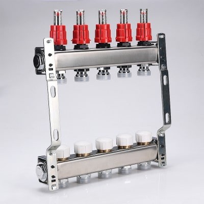 Коллекторные блоки из нержавеющей стали VTc.584 служат для распределения потока транспортируемой среды по контурам системы напольного отопления. Коллекторный блок из нержавеющей стали с регулирующими клапанами и расходомерами VTc.584 рассчитан на применение в системах водяного отопления с максимальной рабочей температурой 70 °C и давлением до 6 бар включительно. Коллекторный блок объединяет в себе подающий и обратный коллекторы из нержавеющей стали AISI 304, ручные настроечные клапаны с расходомерами (ротаметрами), регулирующие клапаны (с возможностью установки электротермического сервопривода), пробки коллекторов и крепежные кронштейны из оцинкованной стали. В состав блока не входят элементы сервисной группы. Данные коллекторные блоки можно использоваться в системах, где в качестве теплоносителя используется вода либо незамерзающие гликолевые смеси. Число выходов -- от трех до десяти. Присоединение трубных петель осуществляется с помощью фитингов стандарта «евроконус».