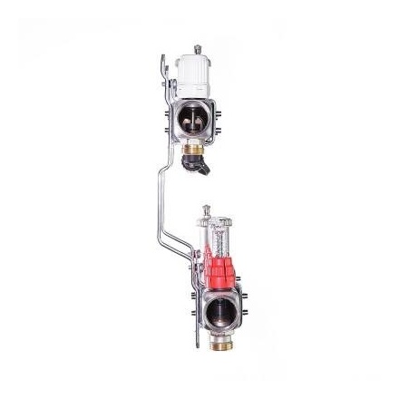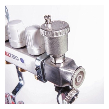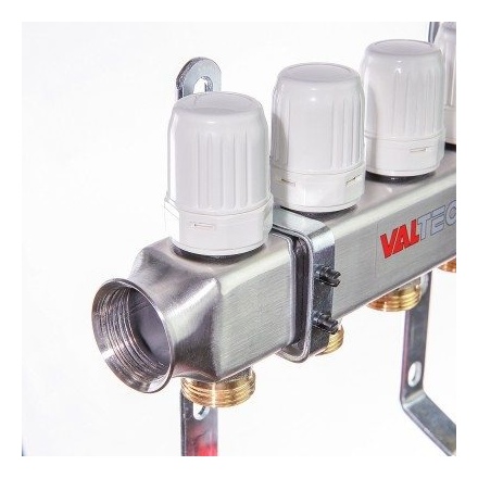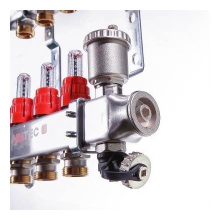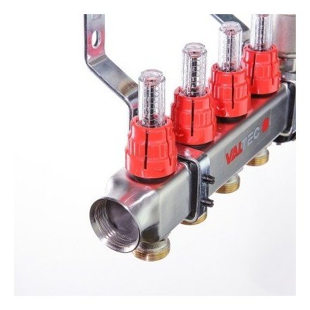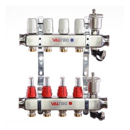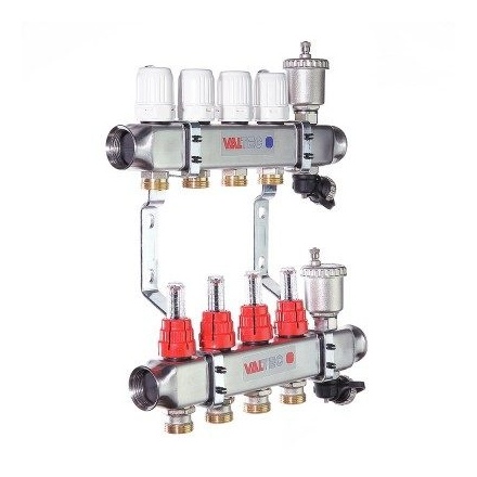 (VTc.586.EMNX) Коллекторные группы для теплого пола. Укомплектовано ручными регулировочными клапанами с расходомерами, обратного – ручными запорными клапанами, с возможностью установки сервоприводов. В комплекте автоматический воздухоотводчик и дренажный кран. Материал – нержавейка AISI 304. Все комплектующие произведены методом горячей штамповки из латуни CW617N, уплотнительные кольца, золотниковые прокладки клапанов – из EPDM 70Sh. Количество выходов – от 2 до 12, рабочее давление – 8 бар, рабочая температура – 90 °С. Условный диаметр коллекторов – 1". Резьба выходов – наружная, 3/4". Присоединение циркуляционных петель осуществляется с помощью фитингов стандарта «евроконус».