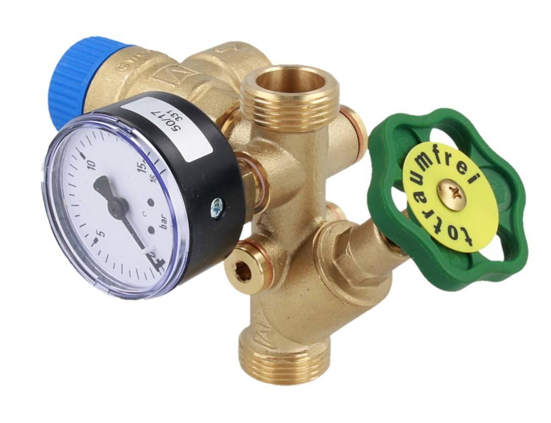 Группа безопасности для бойлера ГВС предназначена для защиты бойлера косвенного нагрева от чрезмерного давления и измерения давления. Изготовлена из латуни и оснащена предохранительным клапаном MSW на 6 бар, а также механическим манометром, обратным клапаном запорным вентилем. Оборудована предохранительным клапаном, манометром, запорным клапаном, обратным клапаном.