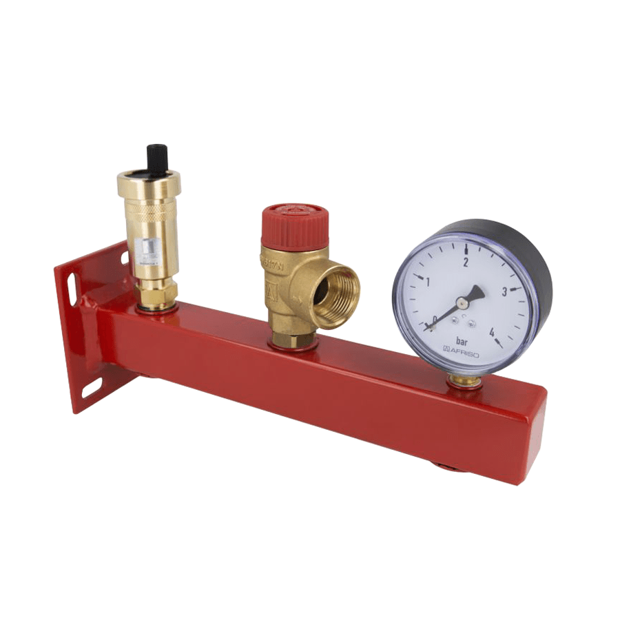 Группы безопасности котлов предназначены для защиты закрытых систем отопления от гидравлических, термических перегрузок и завоздушивания. Группы безопасности монтируются в вертикальном положении на подающем трубопроводе, после котла. Между котлом и группой безопасности не должно быть запорной арматуры. Рабочая температура Tmax – 120°C.