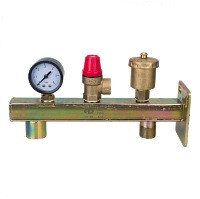 Группа безопасности расширительного бака представляет собой смонтированные на полой консоли предохранительный клапан (настройка - фиксированная, 3 бара), автоматический воздухоотводчик, манометр.