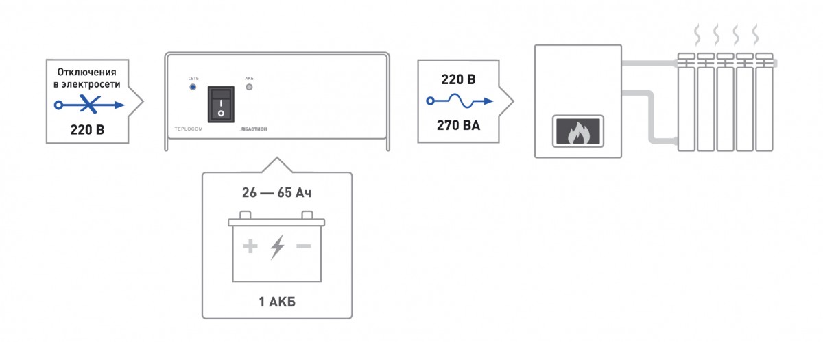 Источник предназначен для непрерывного электроснабжения котлов индивидуального отопления с автозапуском, оснащённых циркуляционными электронасосами, он обеспечит ваше отопительное оборудование качественным электропитанием, защитит его от сетевых неполадок и предотвратит выход оборудования из строя.