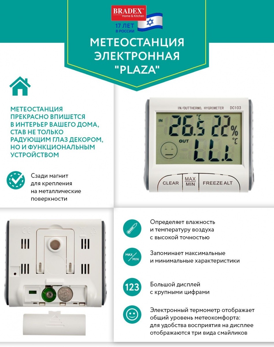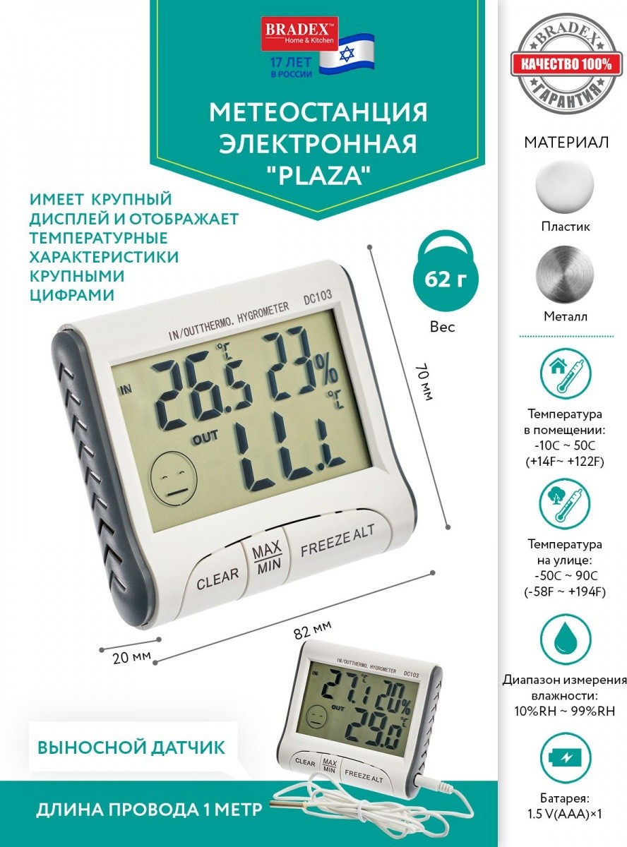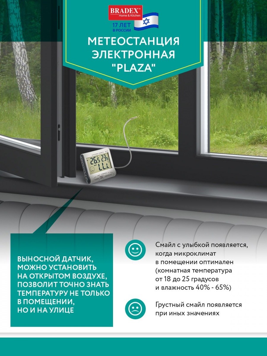 Домашняя электронная метеостанция «PLAZA» станет незаменимым помощником для определения температуры и влажности воздуха в доме и за окном. Она не только с высокой точностью определяет физические характеристики, но и способна дать оценку общему уровню метеокомфорта — для этого на дисплее используются два вида смайликов. Выносной датчик, который можно установить на открытом воздухе, позволит точно знать температуру не только в помещении, но и на улице. Метеостанция имеет крупный дисплей и отображает температурные характеристики крупными цифрами, что будет удобно для всех членов вашей семьи. Встроенная память метеостанции сохраняет максимальные и минимальные характеристики. Метеостанция прекрасно впишется в интерьер вашего дома, став не только радующим глаз декором, но и функциональным устройством.
