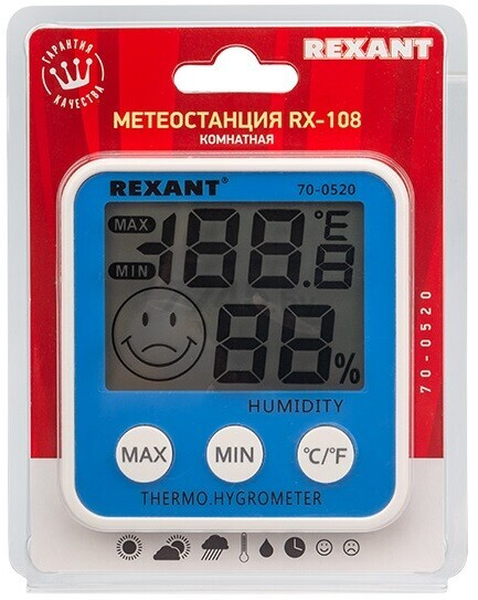 Комнатная метеостанция REXANT RX-108 предназначена для измерения показаний температуры и влажности в помещении. Регистрирует в памяти максимальное и минимальное значения температуры и влажности. Отображает общий уровень метеокомфорта в помещении. Имеет настольную подставку и магнитное крепление.
