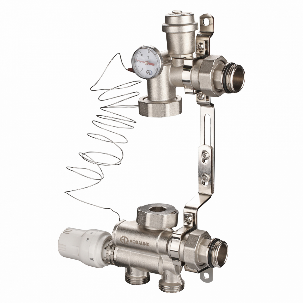 Узел состоит из гидроблока подачи теплоносителя, гидроблока-байпаса смесительного узла, автоматического воздухоотводчика, термостатической головки с выносным термоэлементом и регулируемого кронштейна. Корпус изделия, включая воздухоотводчик, выполнен из никелированной латуни ЛС58-3 (CW614N).