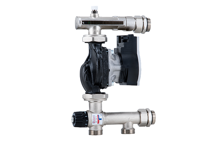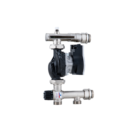 В состав группы входят циркуляционный насос, термостатический смесительный клапан, термометры с ЖК-шкалой, измеряющие температуру в линии подачи в систему, ручной воздухоотводчик, фитинги для подсоединения распределительных коллекторов.