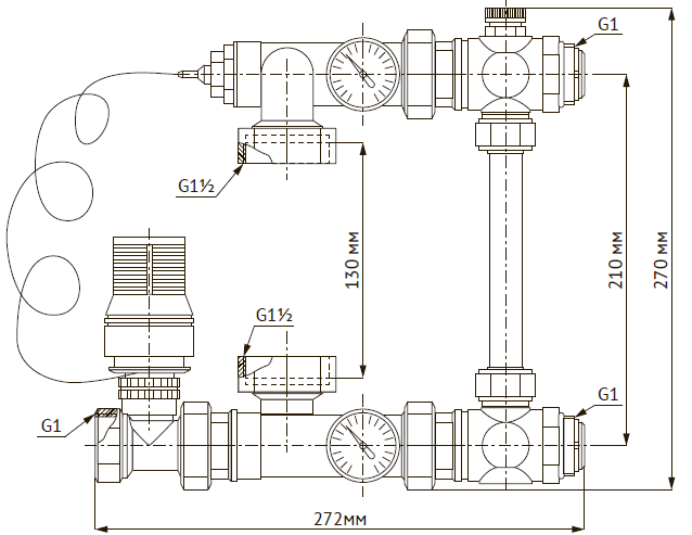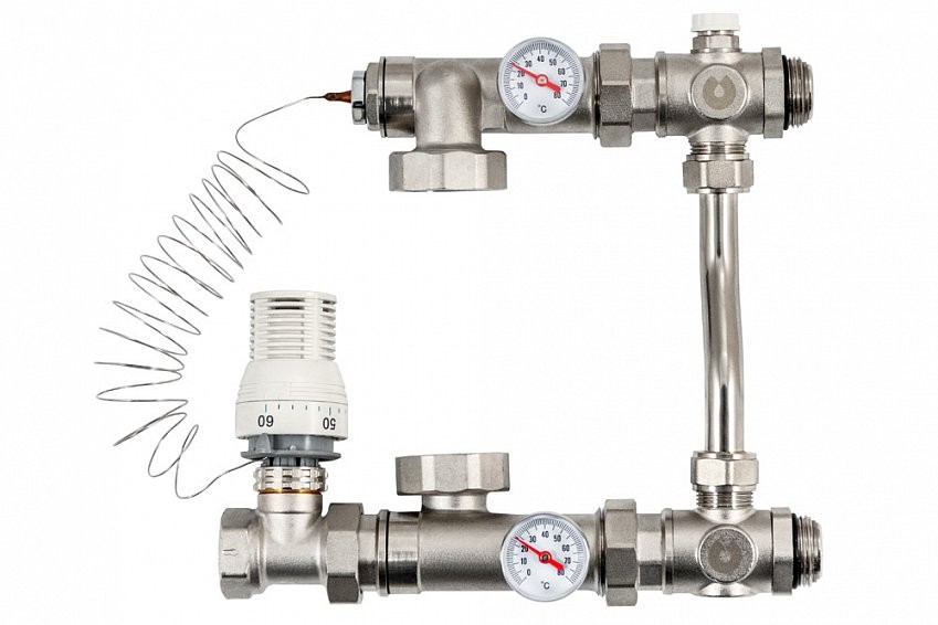 Насосно-смесительный узел применяется в системах отопления зданий и предназначен для поддержания заданной пользователем температуры и расхода теплоносителя в системах водяного подогрева пола. Узел оснащён термостатическим клапаном и термоголовкой с выносным погружным датчиком, которые обеспечивают плавное и непрерывное регулирование расхода и температуры в системе. Узел может эксплуатироваться совместно с циркуляционными насосами различной мощности, имеющими монтажную длину 130 мм и присоединительную резьбу G1½.