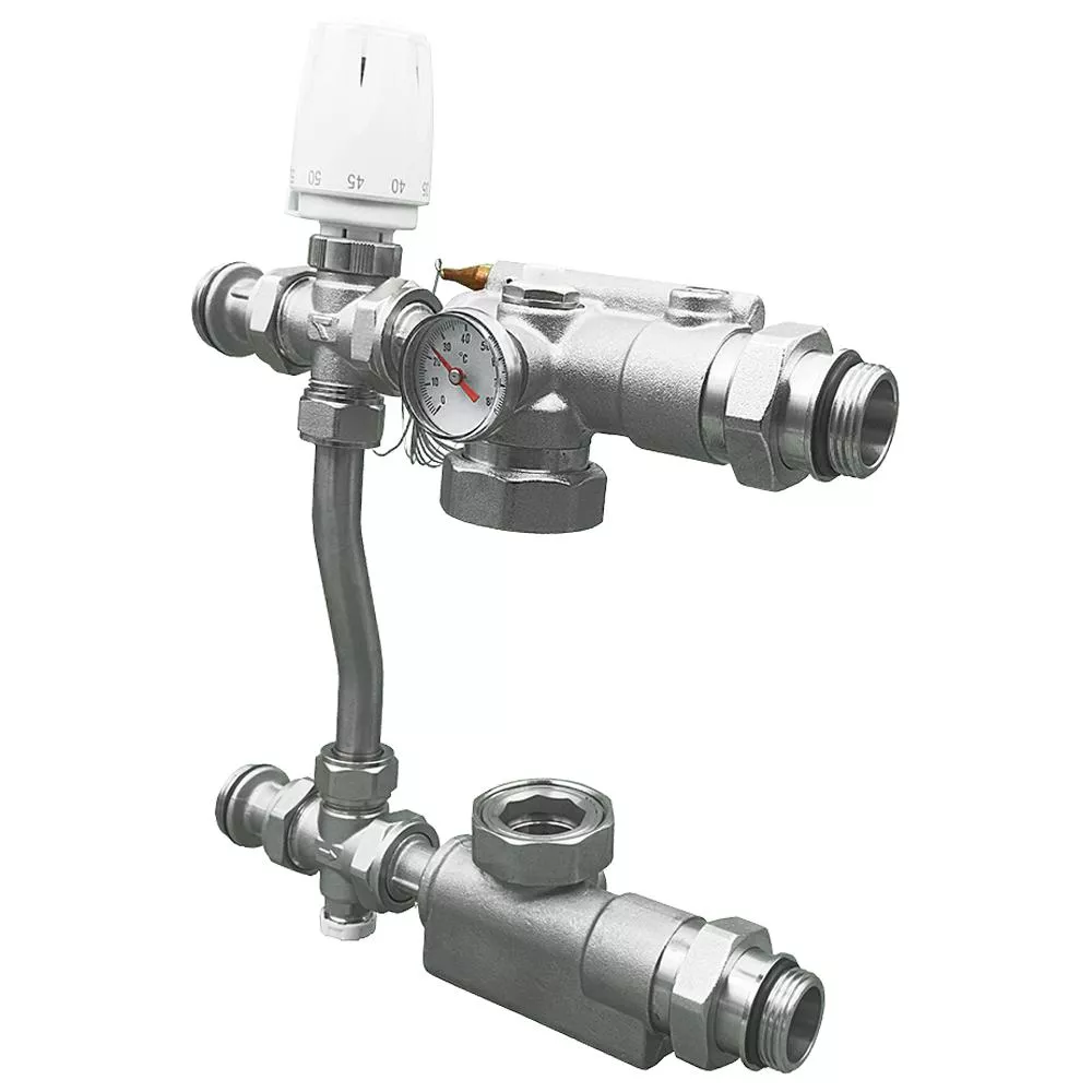 Узел состоит из гидроблока подачи теплоносителя, гидроблока-байпаса смесительного узла, автоматического воздухоотводчика, термостатической головки с выносным термо-элементом и регулируемого кронштейна. Корпус изделия, включая воздухоотводчик, выполнен из никелированной латуни ЛС58-3 (CW614N).