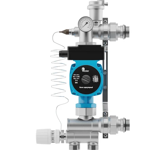 Насосно-смесительный узел Wester 0-33-0010 применяется в системах встроенного водяного отопления. Модель обеспечивает гидровлическую балансировку высокотемпературного и низкотемпературного контуров; создание в системе отопления теплого пола циркуляционного контура с пониженной до настроечного значения температурой теплоносителя; поддержание температуры и расхода теплоносителя на заданном уровне.
