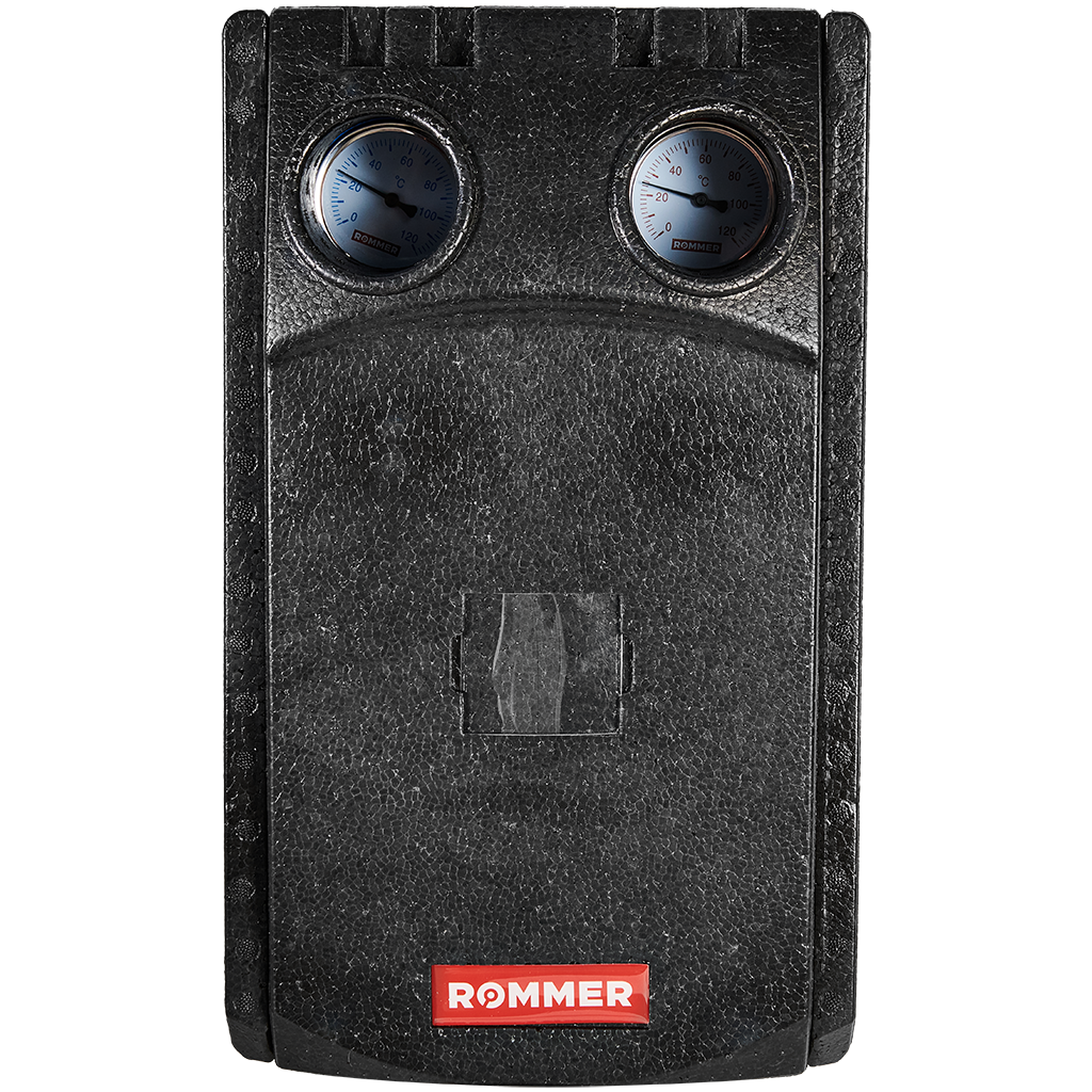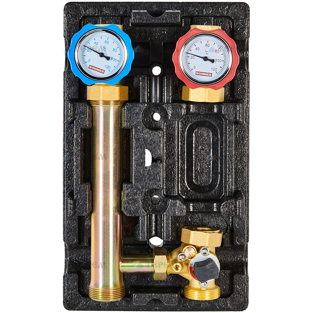 Насосная группа с 3-х ходовым смесителем 1 Rommer без насоса представляет собой набор элементов для обеспечения циркуляции и регулирования температуры теплоносителя в системе радиаторного отопления или “теплого пола”.