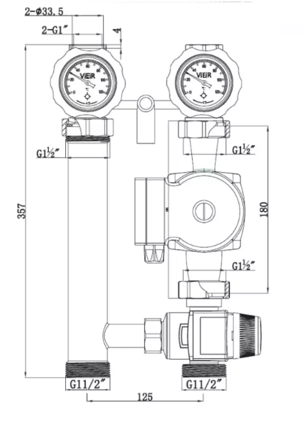 Насосная группа с трехходовым термостатическим смесительным клапаном KVS 4.5 VIEIR без насоса (VR218-25/6), материал: сталь, латунь